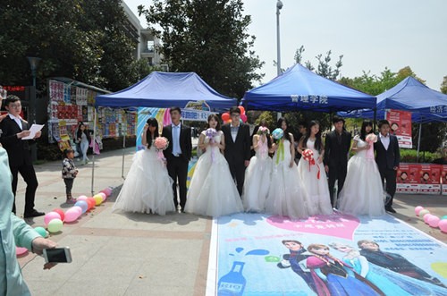 在主持人简短的开场白后,婚纱秀活动正式开始。四对学生情侣为观众带来了唯美的婚纱秀表演,登场、宣誓、交换戒指、抛捧花、疯狂大搜集、默契大考验等几个环节串成了美丽的场景,让观众一饱眼福。其中,疯狂大搜集环节要求情侣们根据所给定的词语,找出相符合的物品,可以与观众互动,借取相关物品。在场的四对情侣积极求助于观众,温暖与祝福在一借一还中被传递。男主角们精神帅气,女主角们妩媚动人,空中气球纷飞,耳旁音乐或浪漫或激情,爱的气息弥漫全场。现场观众不时发出欢呼声,争相拍照留念。