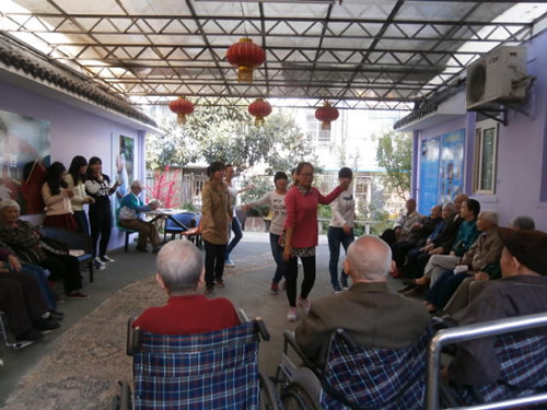 经过一个小时的车程后,终于到达了南京博爱老年公寓。老年公寓的负责人热情地接待了我们,并向我们介绍了博爱老年公寓的基本情况:博爱老年公寓已经拥有4年的历史,目前可容纳80多位老人,有全智老人、半失智老人和失智老人,只要符合条件,博爱老年公寓都会以博爱之心接纳他们;它坐落于居民小区里,环境优雅,能让老人更加感受到家的熟悉和温暖。然后,老年公寓的爷爷奶奶们一起唱了一首歌并朗诵了一首诗来表达对我们到来的欢迎之情。随后,我们给老人们表演了事先准备好的节目,想以这样的方式来表达我们对爷爷奶奶的爱,给他们带来快乐。我们表演的节目有独唱、民族舞、戏曲、小品、养生知识和大合唱等,爷爷奶奶们专注地观看着我们的表演,并不断地拍手称好。其间,在歌曲的高潮时分,爷爷奶奶们情不自禁的随我们一起歌唱,整个院子里充满欢歌笑语。最后,一位奶奶高兴地为我们唱了一首红歌《毛主席带领我们打江山》,还有一位奶奶给我们唱了一段京剧,一位爷爷兴致勃勃地朗诵了他自己作的几首诗,我们听的很认真也非常开心。由于老人需要休息,为了不过分打扰,我们在中午时分依依不舍地离开了老年公寓。