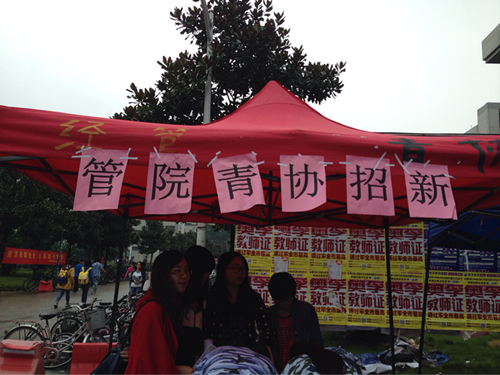 活动正式开始前,主席团和所有中干在南三食堂开会商量好招新的细节,分配好每个人的工作。会议过后,招新活动正式开始。部分中干挂起宣传横幅,搭起帐篷,摆好桌椅,并贴上“管院青协招新”几个大字。中干们拿着宣传单和报名表,在帐篷外等待新生前来咨询。只要有新生过来咨询,我们便积极介绍青年志愿者协会各个部门的不同优势和各自的侧重点及青协的知名活动,让新生对青年志愿者协会的各个部门有所了解,可以根据自己的喜好填报相应的部门。截止活动结束,我们共收到大约百份招新报名表,这与往年相比是有所进步的。招新活动结束后,主席团和所有中干开了总结会议,也定出了下一步招新的工作计划。