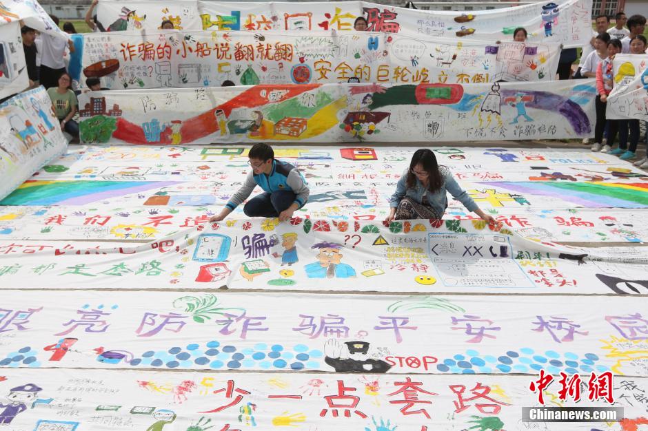 中午12点活动正式拉开帷幕,操场跑道上三路排开,22个班级的同学各自在8米长的画布上同时作画,远远望去甚是壮观。经过前期的精心构思和设计,同学们一个个拿着作画的笔刷,手绘“防诈骗”主题的简笔动漫图、流行语,描红摹绿,挥洒自如。画布上“诈骗的小船说翻就翻”,“亲,你可长点心吧”,“千里之外不见面,提防网络把你骗”,“招聘广告莫轻信,天上不会掉馅饼”等或萌或朗朗上口,过目不忘的语句,配上五彩颜色,特别吸引眼球。彩绘的素材更是别出心裁,有最新电影《疯狂动物城》中的兔子朱迪,有微信、QQ、天猫的图标,有的绘制表情包四格漫画,有的班级还在画卷中融入南邮元素,画出三牌楼的物联网大楼,眼镜湖和图书馆等。有的同学激动地告诉记者:“我们班设计了短信诈骗,兼职诈骗,二维码诈骗等板块”,“我们班是精细化分工的”,“我们昨晚讨论到很晚,还用铅笔打好了底稿。”同学们在现场忙得不亦乐乎,很多人手上沾满了颜料,但那些宣传标语也被记住了。