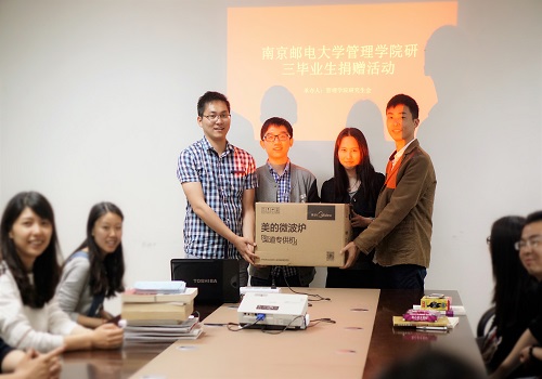 紧接着,毕业班班长将购买的毕业纪念品——微波炉呈现在大家眼前,在大家共同见证下,正式捐赠与研究生一年级和二年级的学生们,并送上暖心的祝福,真切地希望大家在学的好同时能够吃的好。与此同时,研究生一年级和二年级的班委代表接受捐赠并进行合影留念。