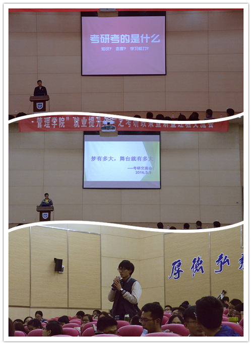 交流会伊始邓艳华副书记作了鼓舞人心的考研动员,她强调不要在最需要拼搏的年纪选择安逸,要端正考研动机,明确考研目标,完善考研规划。路漫漫其修远兮,考研是寂寞的旅程,更是值得付出收获回报的宝贵的人生经历。接下来,研究生招生办顾莹副主任作研究生招生政策和策略的宣讲,她立足于本校历届考研数据对当前的考研趋势作了重点分析,介绍了学校出台的有关考研的优惠政策,并解答了在座学生对于考研流程的疑惑。最后,学院邀请5位杰出的考研成功学生代表轮流上台,介绍他们的考研经历和学习经验。他们以优异的成绩考入南京大学、上海财经大学、南京邮电大学等高校,并在此每个人针对某个侧重点介绍考研经验,毫无保留,倾囊相授:工商管理专业张惠康学长就每一门考研科目的学习技巧做了详细的经验传授;市场营销专业周阳学长细致讲解考研英语题型及得高分方法,并强调一定要抓好单词基础;跨专业报考成功的信息管理与信息系统专业程阳学长有针对性介绍了跨专业报考如何全面复习、如何攻坚克难的技巧;人力资源管理专业刘健阳学长以393分高分考取南大的经历,讲述了自身考研心得体会及各科目复习要点;电子商务专业成岑学长强调了考研期间信息的搜集、复习科目的时间分配及心态的重要性。