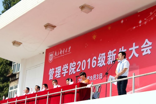 大会在雄壮的《国歌》声中拉开帷幕。黄卫东院长首先致辞,代表学院对新同学的到来表示热烈的欢迎,并向同学们简要介绍了“三十而立”的管院的办学历史、师资力量、教学设施及专业特色,同时希望广大新生用不懈的努力去创造人生的风景,用良好的态度去铸就人生的高度。他同时强调,目前我校正全面实施“十三五”规划,深入推进高水平大学与一流学科建设,希望同学们抓住机遇,努力学习,在实现自己人生目标的同时,也为学校、学院的发展作出贡献。