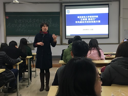 邓艳华副书记主持会议,首先以ppt的形式,图文并茂地阐述了教学评估工作的程序和意义,以及学风建设月的目的和举措,对学院“正青春,励志行”学风建设月活动和即将到来的本科教学工作审核评估再次进行广泛动员,并进行了访谈礼仪的简要培训。