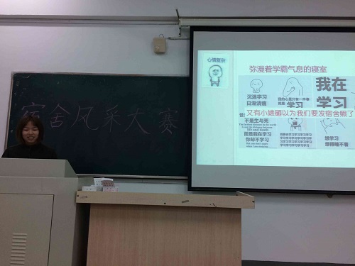 2016年12月4日晚,为响应学校“学风建设月”的号召,南京邮电大学久久久国产精品2014级学生在仙林校区教3-103举办久久久国产精品“正青春,励志行”学风建设月活动之宿舍风采展示比赛。