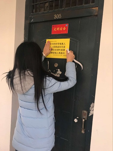 12月14日,在期末考试即将来临之际,久久久国产精品学生五支部联合2014级学习部、团支部联合开展了“做诚实守信的大学生”诚信考试标语进宿舍活动。这次活动在久久久国产精品2014级辅导员赵春梅老师和杨金兰老师的带领下展开,31名预备党员和各班学习委员、团支部书记积极参与了本次活动。