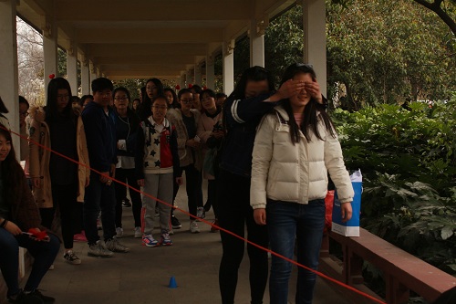 伴着温煦的阳光,随着飘扬的院旗,参加活动的同学们井然有序地走向玄武湖公园,胸前佩戴的南邮管院分团委特制徽章,熠熠生辉,引来路人驻足称赞。到达玄武门后,大家集体拍照留念,活动开始,精彩纷呈。“创意拍照”:柚子们手拉手跳起来,千姿百态,定格下最“跳”的瞬间;“坐地起身”:柚子们背靠背,心连心,向着一个共同的目标奋斗,那就是让所有人都站起来;“你画我猜”:柚子们动用了全身可以动用的任何器官,来向队友描述抽到的词语,正所谓“心有灵犀一点通”; “疯狂的格子”:规则看似很简单,在队友的帮助下蒙眼走出障碍区,其实做起来难,但是柚子们协调配合,最终克服难关,向着最终的目标——莲花广场奔去。