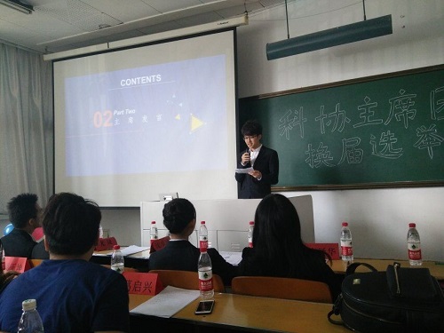 本次大会由外联部部员杨童和组织与策划部部员刘聪主持,大会共分为三项议程,第一项议程:现任主席团发言,活动伊始由科协主席沈承涛发言,主席对科协过去的工作做出了总结,表达了对全体科协成员的期望,同时还强调了科协的家文化氛围,希望科协继续传承与发扬。接下来主席团成员逐一发言,他们都表示对参加竞选的各部门的候选人以及对全体科协成员充满信心,相信接下来的工作中表现更加出色,表示期待科协接下来的工作取得更大的突破。