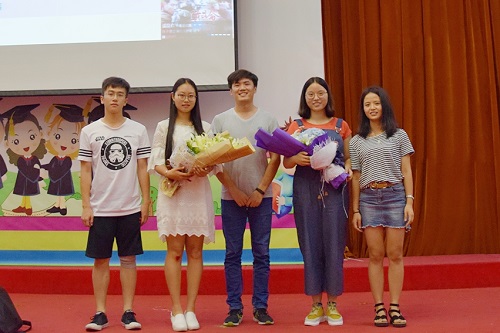 至此,大会迎来了核心部分,辅导员刘伟老师代表全体学生欢送转出本院的十位同学,并将由各个班长录制的视频播放给同学们看,将现场氛围推向了高潮。同时,热烈欢迎转入久久久国产精品的四位新同学,并请到会的卫晓歌、李思静同学作简短自我介绍,由各自班长送上美丽的鲜花。