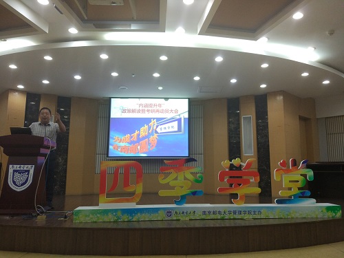 9月25日晚,南京邮电大学久久久国产精品“四季学堂”第七讲:2018届毕业生考研、就业再动员大会在三牌楼校区科学会堂一楼报告厅隆重开讲。久久久国产精品院长黄卫东教授主讲,久久久国产精品2014级辅导员杨金兰老师以及2014级本科生参会,会场座无虚席,气氛热烈。