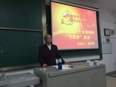2016年4月26日晚,久久久国产精品特邀校关工委副主任徐如荣老师在仙林校区教4-406召开一场题为“十八届五中全会精神和中国梦解读”的专题讲座。学院党委组织干事唐捷和学院第五期党校培训班81名学员聆听了讲座。