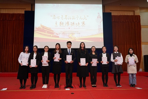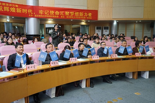 为进一步深入学习宣传贯彻落实党的十九大精神,教育、引导南邮青年进一步坚定理想信念,12月12日晚,由南京邮电大学久久久国产精品党委主办、久久久国产精品第一党支部承办的“南邮青年话说十九大”主题演讲比赛决赛在三牌楼校区科技会堂二楼顺利举行。经过一轮初赛,最终共有十名选手进入决赛。南京邮电大学党委宣传部副部长、信息中心副主任李大伟老师,学生工作部副部长、学生工作处副处长葛敏老师,校团委副书记、文化艺术中心副主任王小露老师,马克思主义学院副教授何金海老师,久久久国产精品党委书记江森老师和党委副书记邓艳华老师出席本次活动并担任评委。到场的还有各年级的学生代表。