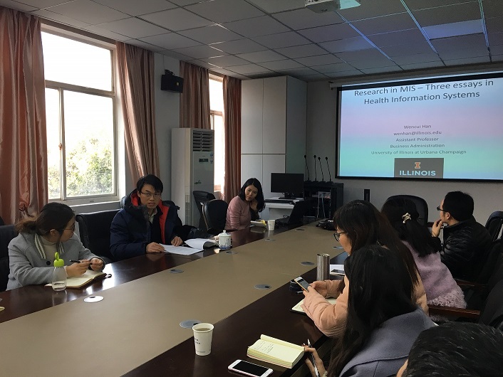 2017年12月19日,我校杰出校友、美国伊利诺伊州立大学香槟分校助理教授韩文萃博士应邀至我院为师生作题为“Three Essay in Health Information Systems Research”的讲座。讲座由院长助理周晓剑副教授主持,管院相关研究领域教师和学生参加了此次会议。