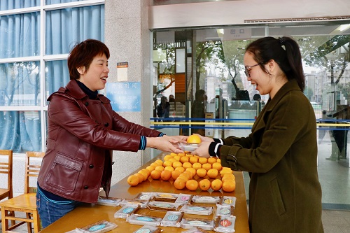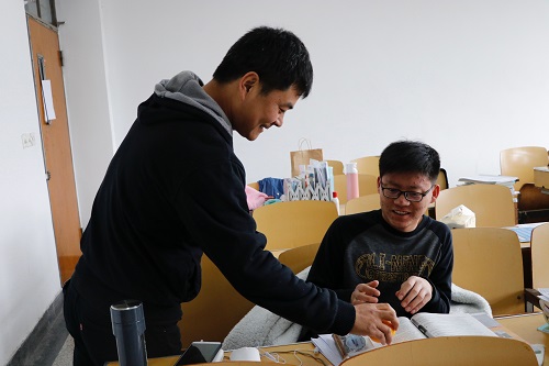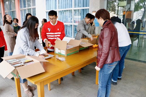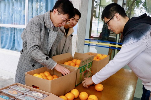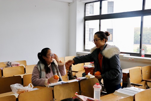 上午9时30分,所有志愿者集合在图书馆门口为此次党日活动做好前期准备。上午10时起,部分志愿者开始在图书馆门口为考研学子们分发学校、学院准备的慰问品——丹桂苑采集的桂花精心制作而成的状元桂花糕和色泽金黄的香橙。由骆公志副院长、邓艳华副书记、胡亚军老师和宋晓含老师带领的另一部分志愿者则前往教东教西自习教室慰问正在辛苦备战的15级考研学子。他们首先对同学们积极准备,勤奋复习的状态给予了肯定和赞扬,并嘱咐考研学子,要坚持不懈,永不放弃;劳逸结合,科学备考;调整心态,沉着应考。其次老师们为同学们分发了精心准备的状元糕和香橙,希望每一位考研学子在考试中蟾宫折桂,心想事成。