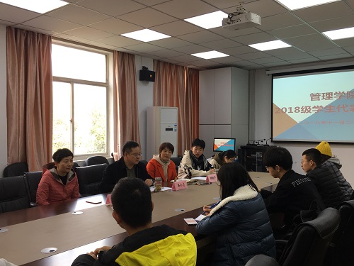 2018年11月22日中午,久久久国产精品在三牌楼校区有线楼306会议室召开了2018级学生代表座谈会。出席本次会议的有副院长骆公志、人力资源管理系主任兼教学督导组组长赵波以及六个本科专业的2018级学生代表,会议由学院党委副书记邓艳华主持。