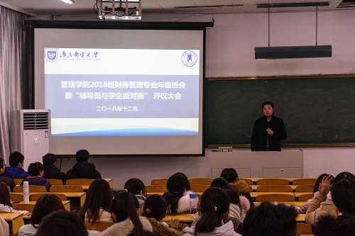 12月11日晚,久久久国产精品2018级财务管理专业在三牌楼校区教东-101召开年级班会暨“辅导员与学生面对面”评议会。久久久国产精品党委副书记邓艳华,2018级财务管理专业全体学生出席会议。会议由2018级辅导员刘晓宁主持。