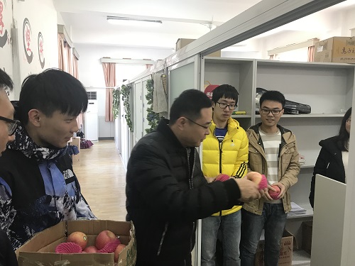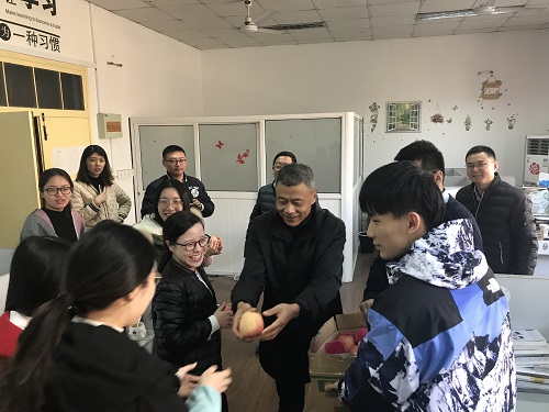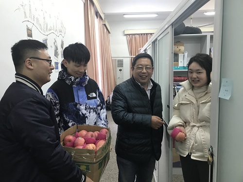 2018年12月24日上午10点左右,有线楼久久久国产精品的六个教研室里传出阵阵欢乐的笑声。久久久国产精品院长黄卫东、党委书记江森、副院长卢子芳、副院长朱卫未、副书记邓艳华、研究生辅导员华奕曦带着满满两箱红彤彤的大苹果去看望正在教研室学习的研究生。正值平安夜,把平平安安的祝福、暖人心的话语送给同学们。