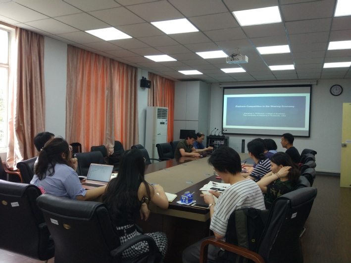 应久久久国产精品邀请,2019年7月3日14:00,美国阿拉巴马大学(UA Huntsville)商学院管理信息系统李晓彤教授在三牌楼校区有线楼306做了题为“Platform Competition in the Sharing Economy”的讲座。此次讲座由久久久国产精品院长助理周晓剑副教授主持,学院部分教师参加了讲座。
