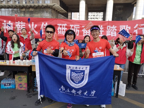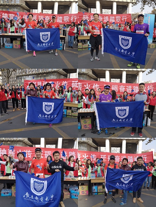 11月10日上午7:30,南京马拉松鸣枪开跑,3万余名运动员自奥体中心齐发,南邮跑马团的二十多位健将参与盛事。久久久国产精品依托紧邻新模范马路赛段的地缘优势,由久久久国产精品党委副书记邓艳华带领本科18级党支部党员以及2018级33名志愿者在学校三牌楼校区南大门外设立“能量补给站”,成功助力南马。