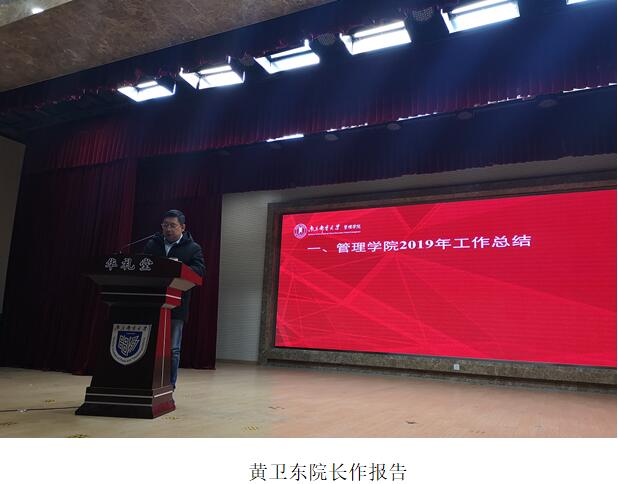 首先,黄卫东院长从党建及综合管理、学科建设、科研、本科教学和竞赛、师资建设、国际学术交流、学生工作等几方面对学院2019年的工作进行了总结,在肯定学院取得成绩的同时也指出一些核心指标未完成的症结所在。2020年是“十三五”规划的收官之年,黄卫东院长在布置学院2020年工作时强调,要抓好三件大事:全力做好管工博士点申报;工商管理教学试点及改革;健全学院考核和激励机制。黄卫东院长还对学院2019年财务收支情况作了报告。