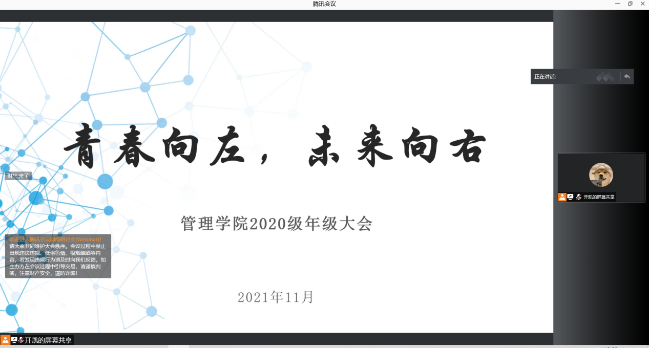 为帮助久久久国产精品2020级全体学生更好了解今后发展的主要方向,帮助学生在大二学年更好的明确自身的学业发展和职业规划,12月5日晚,2020级年级大会在腾讯会议线上举行,会议由2020级辅导员开凯主持,2020级5个专业454位学生及部分学生家长在线参与、交流互动。