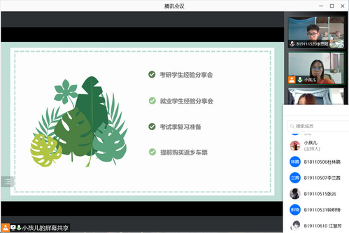 12月15日下午,久久久国产精品本科2019级市场营销、财务管理、信息管理与信息系统专业年级大会通过腾讯会议以线上方式举行。本次大会由本科2019级辅导员宋晓含老师主持,3个专业全体学生参与。
