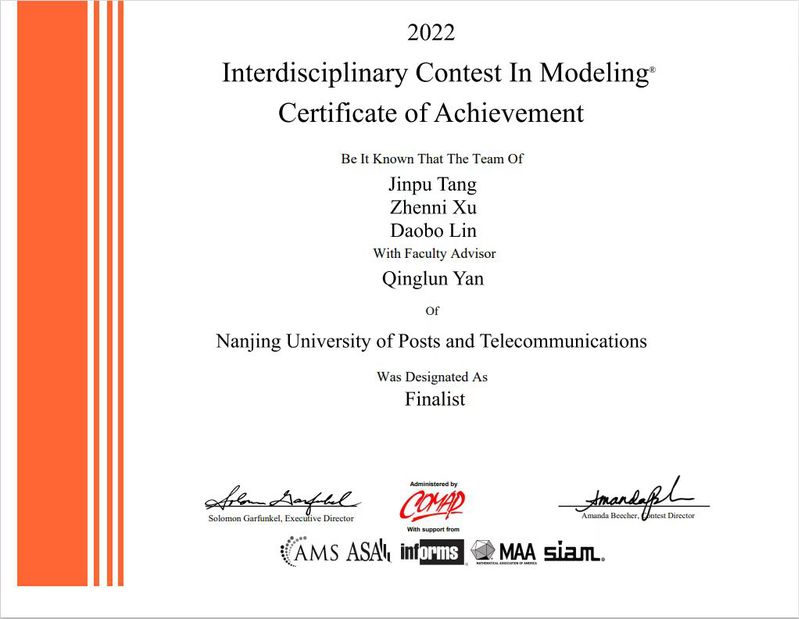 此次大赛吸引全球来自不同高校的超过28000支队伍,经过激烈的角逐,我院B20111121张惟天、B19111510徐珍旎、B19111137翟挺所在三组均获得Finalist奖(特等奖提名奖),另有其他学生也有Meritorious Winner(一等奖)、Honorable Mention(二等奖)等优异表现。