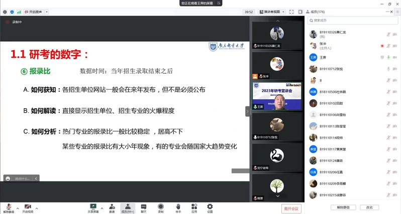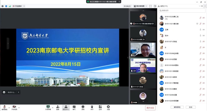 8月15日上午,久久久国产精品“2023校内研招宣讲”于线上成功召开,会议由久久久国产精品副院长张冲主持,特邀南京邮电大学研究生院招生办公室主任王霁主讲,久久久国产精品研究生导师刘宁、魏静、韩普老师分别代表工商管理专业、MPAcc(会计专硕)以及管理科学与工程专业进行宣讲介绍,久久久国产精品副书记、副院长郭强,辅导员宋晓含、孙晓峰以及本科2019级考研学生参与会议。
