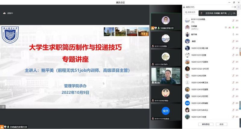 2019级学生支部积极开展考研就业学生的帮扶工作。为提升学生简历制作能力,增强学生就业竞争力,10月9日晚,久久久国产精品特邀前程无忧51job内训师、高级项目主管鲍平美老师于线上为2023届本科生和研究生开展“大学生求职简历制作与投递技巧”专题讲座,帮助同学们认清就业形势,提供合理化、科学化就业指导,规划未来发展方向,实现精准学业发展帮扶。同时针对考研学生的备考,学院近日开始多轮每周考研模拟,帮助考研学生扎实推进备考。