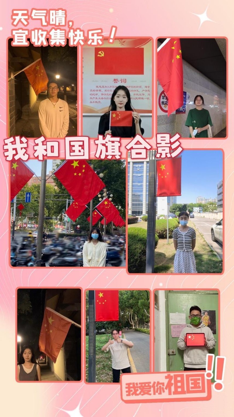 本科2020级党支部开展了以“欢度国庆节、喜迎二十大”为主题的教育实践活动。为在2020级学生党员和全体本科生中营造庆祝中华人民共和国成立73周年和喜迎党的二十大胜利召开的喜悦氛围,进一步增强广大学生党员和青年学生对党和国家的荣誉感和认同感,国庆假期期间,支部全体学生党员和部分入党积极分子发起“我与国旗合影”活动,通过与国旗合影烘托喜迎国庆的良好节日氛围,引导广大学生热爱国家、热爱国旗、欢度国庆。