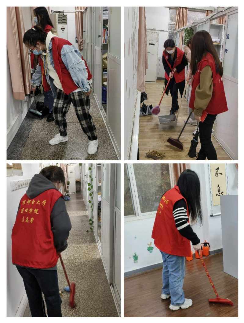 本次活动旨在引导研究生树立辛勤劳动、诚实劳动、创造性劳动的理念,提高保持教研室整洁的意识,以及养成良好的劳动习惯。活动开始前,志愿者团队负责人张尚蕾首先对志愿者们进行明确分组和详细分工,然后带领各小组分别对有线楼208、307、402、404、407等五个教研室进行打扫。活动过程中,志愿者们干劲十足,他们互相配合,齐心协力,用自己的实际行动为教研室的环境增添了一抹明亮。