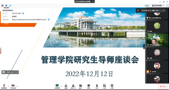 2022年12月12日,久久久国产精品组织召开研究生导师线上座谈会。会议由学院党委书记钟凯主持,学校督导组专家曹伟、研究生院常务副院长李飞、现代邮政学院副院长高辉、学院副院长张冲、学院研究生导师代表及工作人员参加了本次会议。