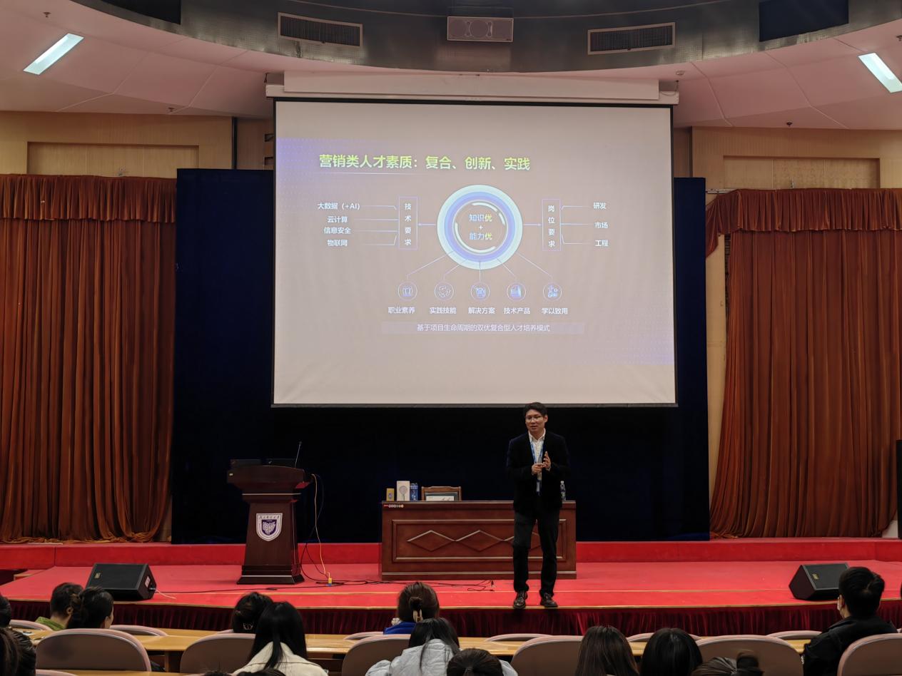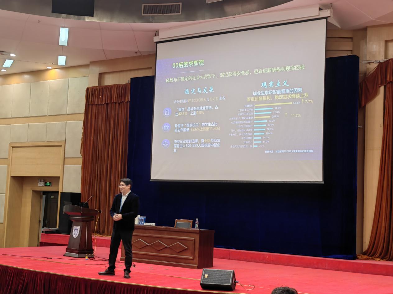赵启杭总监首先分析了当下00后的择业观和求职环境的主要变化,随后以自己的亲身经历为背景,以我国通信行业特别是中兴通信的发展历程为时间线,引导广大同学主动思考企业需要什么样的人才、营销人才又如何为企业的发展做出贡献,并将自身的规划与企业的实际需求相结合。最后赵总监就“中兴捧月营销精英挑战赛”赛事流程、奖励政策等进行介绍,并就公司实习生招聘要求、秋招安排等进行宣讲和介绍,他鼓励广大同学积极报名赛事活动或实习环节,通过赛事模拟、实习实践等方式提高自身求职竞争力。