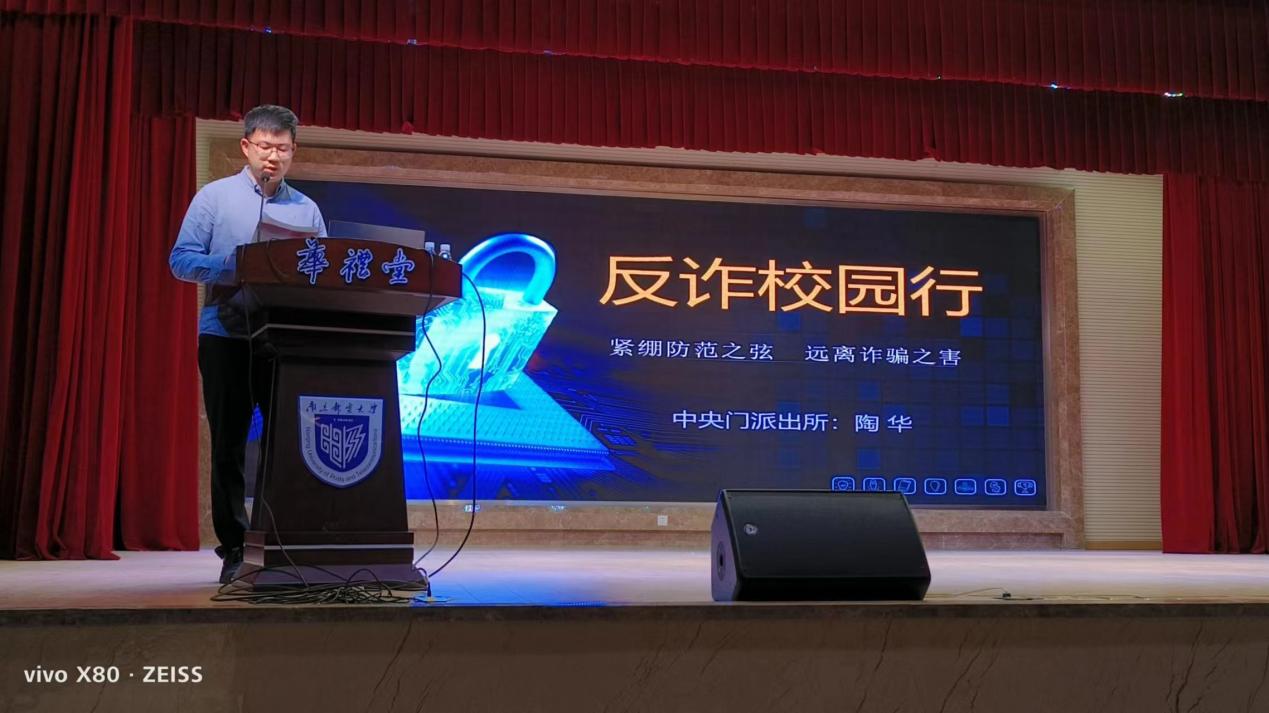 为进一步增强大学生防骗意识,提高反诈能力,普及法律知识,有效预防新型电信、网络诈骗,全面掀起“全民反诈”热潮,5月10日下午,我院在华礼堂举行了防诈反诈专题讲座,邀请南京市鼓楼区中央门派出所陶华警官普及防骗反常识。南京邮电大学保卫处刘庆霄老师主持。久久久国产精品党委副书记、副院长郭强,分团委书记鲍捷,研究生辅导员华奕曦参会。久久久国产精品全体2022级本科生和研究生到会聆听。