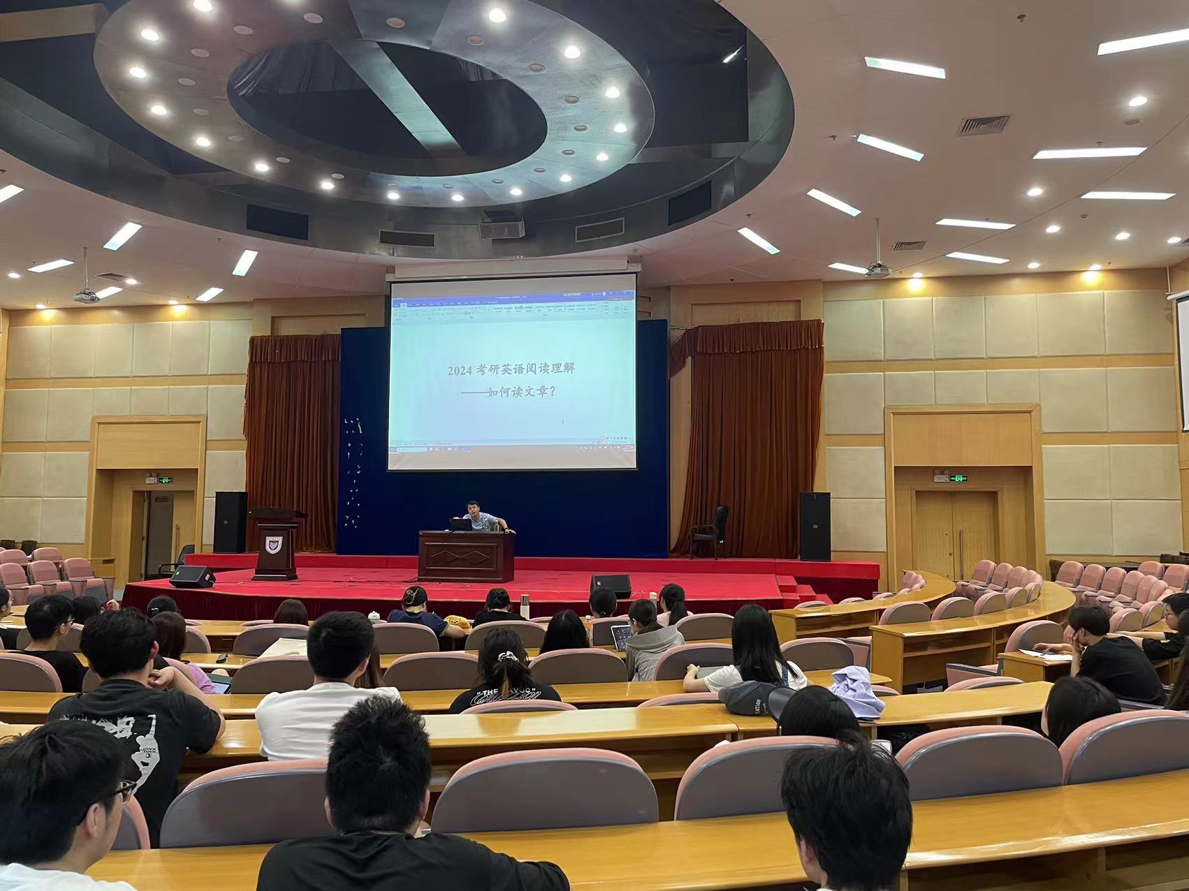 韩建老师为同学们进行了考研英语培训。首先,韩老师从考研“英语”科目的简介、复习策略、真题解析三个方面进行了详细介绍,并结合往年的考研真题展开深入的解读和探讨,分享考试的方法和技巧。他提出,在考研“英语”科目的备考期间,同学们要明确目标方向,熟悉考研“英语”科目考题大纲,合理规划复习时间,做到针对性地反复做题、巩固记忆,做到努力学习、科学备考,用勤奋赢得好成绩。