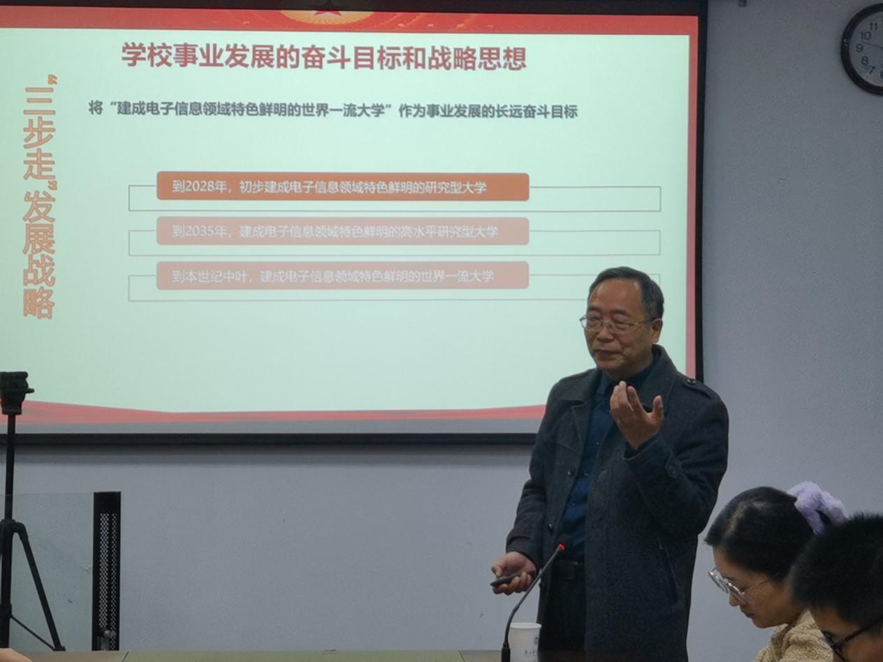 会上,卢教授指出,此次党代会是学校全面贯彻落实党的二十大精神,加快学校国家“双一流”和江苏高水平大学建设关键时期召开的一次十分重要的会议。他围绕“锚定一流 踔厉奋发 加快向研究型大学迈进 为建设电子信息领域特色鲜明的世界一流大学而奋斗”会议主题,依次带领学生进行四个篇章深入学习:一是,第三次党代会以来的工作回顾;二是,学校事业发展面临的形势与奋斗目标;三是,今后五年事业发展的专项行动;四是,坚持和加强党对学校工作的全面领导。在老师领学、学生互学中,同学们进一步明晰了学校实现高质量发展的宏伟目标和奋进方向,激发了奋斗热情和担当意识。