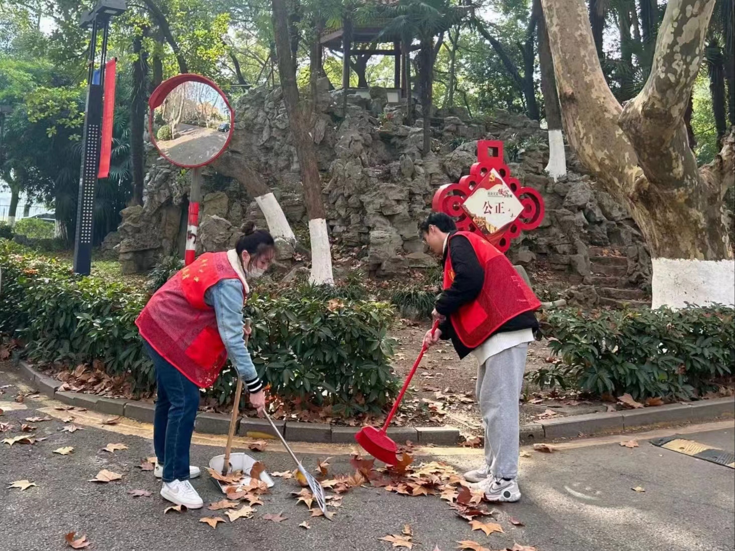 冬日的午后,吹着丝丝凉风,志愿者们在分配好任务后开始了各自的清扫工作。眼镜湖旁、行政南楼边、篮球场以及假山周围都有他们劳动的身影。鲜艳的红马甲像一团团火焰,驱散了冬日的严寒,让校园充满温情。