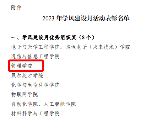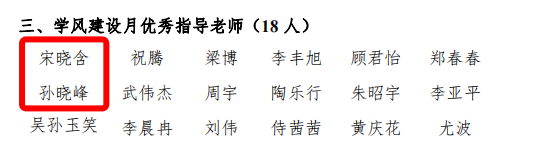 经组织申报、综合评审,我院荣获“学风建设月优秀组织奖”称号,学院“高管大讲堂”活动获评“学风建设月特色品牌活动奖”称号,3个班级获评“学风建设月先进班级”称号,37位同学“学风建设月先进个人”称号,宋晓含、孙晓峰两位辅导员老师获评“学风建设月优秀指导教师”称号。