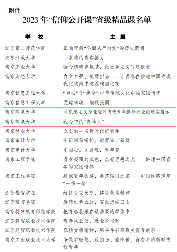 近日,共青团江苏省委发布 2023年“信仰公开课”省级精品课评选结果,我院教师李一鸣报送的课程《马克思主义择业观对当代青年选择职业的现实启示》获评2023年“信仰公开课”省级精品课。