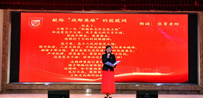 抗日烽火铸就热血英雄,艰苦环境锤炼钢铁精神。数不清的英雄事迹令人钦佩动容,校关工委张菁老师为“战邮英雄”献上饱含深情的致敬词。“忠于党,忠于人民的坚定立场;保守机密,人在文件在,不怕流血牺牲的革命精神;排除千难万险,勇往直前完成传递任务的坚强意志;严守纪律,艰苦奋斗,雷厉风行的战斗作风。”这就是忠贞不渝、使命必达的战邮精神。过去,战邮精神曾指引着先辈踏平邮路的艰难险阻;如今,战邮精神将激励着我们笃行不怠,奋勇前行,再续南邮辉煌。