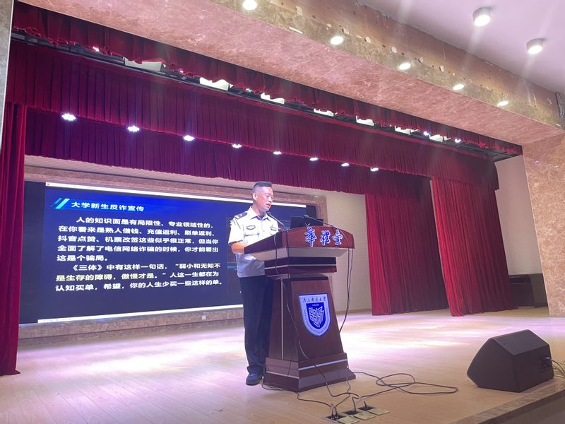 为提高学院同学们的安全意识,增强对电信网络诈骗的甄别和应对能力,今年9月新生入校教育期间,管理学院联合中央门派出所在华礼堂开展“防范于心,反诈于行”民警反诈普法讲座。中央门派出所民警陶华主讲。学院2024级新生参加活动。