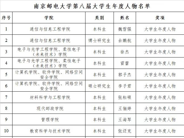 近日,我校公布了南京邮电大学第八届大学生年度人物名单,我院电子商务专业大四学生王海琴荣获大学生年度人物称号,该奖项全校仅十人。