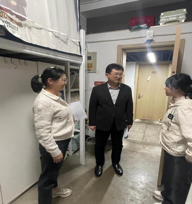 随着天气逐渐转凉,宿舍内违规使用违章电器等安全隐患易发、多发,同时近期呼吸道疾病逐渐增多,干净良好的宿舍环境有利于减轻疾病传播风险,因此检查伊始,郭书记要求全体辅导员要利用此次安全卫生检查为契机,加强学生的安全意识和卫生意识建设,营造良好宿舍环境。在检查走访中,郭书记及辅导员老师同部分宿舍成员进行深入交流,鼓励2025届毕业生抓住考研复习、秋招面试的黄金时期,一鼓作气,祝愿大家顺利到达理想的彼岸,同时详细了解2024级新生及部分老生的学习生活情况,特别寄语2024级新生要珍惜大学时光、踏实学习、勤勉努力,同时要认真做好宿舍卫生工作,为大学生活营造舒适、温馨的住宿环境。