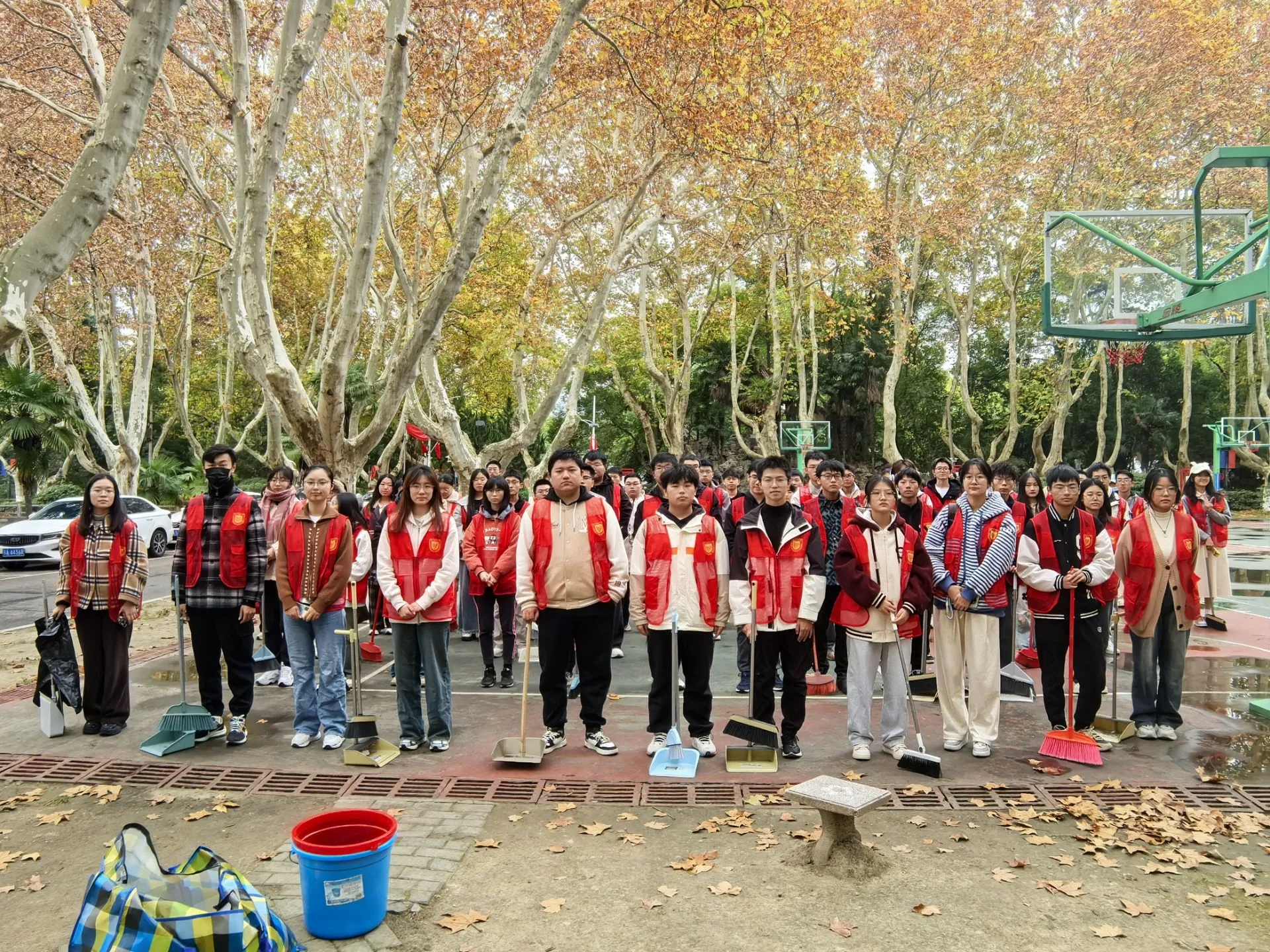 在午后的阳光下,志愿者们身着红色马甲,手持清洁工具,热情高涨地投入到校园美化工作中。从眼镜湖前的林荫大道,到教学楼间的花坛绿地,再到篮球场周边的休息区,处处可见他们忙碌的身影。他们认真清扫落叶,仔细擦拭公共设施,不放过任何一个卫生死角。在劳动过程中,志愿者们相互配合,默契十足,用实际行动诠释了“奉献、友爱、互助、进步”的志愿服务精神。