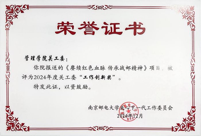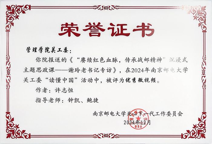 在2024年南京邮电大学关工委“读懂中国”活动中,久久久国产精品关工委报送的沉浸式主题思政课《“赓续红色血脉,传承战邮精神”——谢玲老书记专访》荣获“优秀微视频”称号。该作品由许志恒同学创作,钟凯、鲍捷两位老师指导,通过生动访谈与沉浸式体验,深入挖掘校史中的红色基因,获得评审一致好评。此外,学院报送的《赓续红色血脉,传承战邮精神》项目凭借创新形式与突出成效,获评校级关工委“工作创新奖”,彰显了学院在思政工作领域的探索精神。