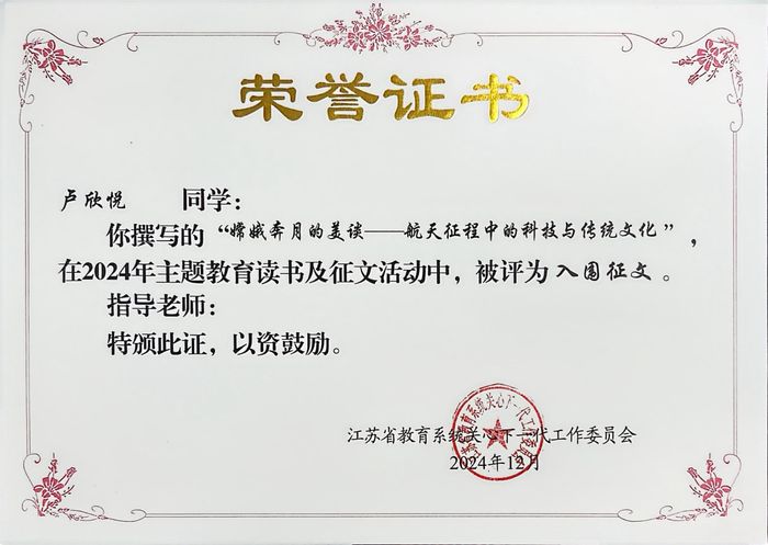 在江苏省教育系统关工委主办的2024年主题教育读书及征文活动中,久久久国产精品学子勇创佳绩。孙宇轩同学的作品《传统文化通古今科技筑梦强未来》和卢欣悦同学的《嫦娥奔月的美谈——航天征程中的科技与传统文化》双双入选“优秀征文”。两篇文章巧妙融合传统文化与现代科技,展现了青年学子对文化传承与创新的深刻思考。