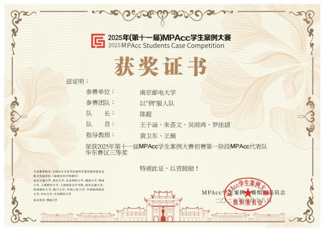 会计专业硕士研究生陈超、王子涵、朱荟文、吴雨鸿、罗佳翃同学组成的“以‘例’服人”队在我院黄卫东、王娟老师指导下,在全国MPAcc学生案例大赛表现突出,荣获华东赛区三等奖。