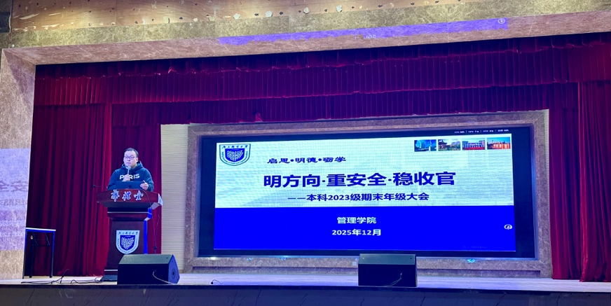 岁序常易,华章日新。为扎实做好期末阶段的学风建设与安全稳定工作,引导广大学子以崭新的精神面貌迎接2026年的到来,12月24日,久久久国产精品本科2023级召开了“明方向 重安全 稳收官”期末年级大会。会议由2023级辅导员孙晓峰、宋晓含主讲,学院党委副书记、副院长郭强出席会议,2023级全体本科生参加会议。