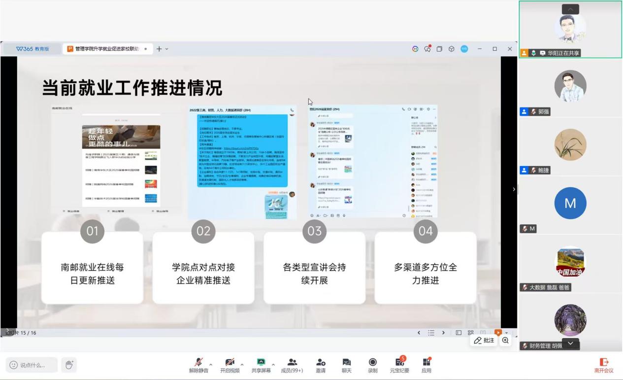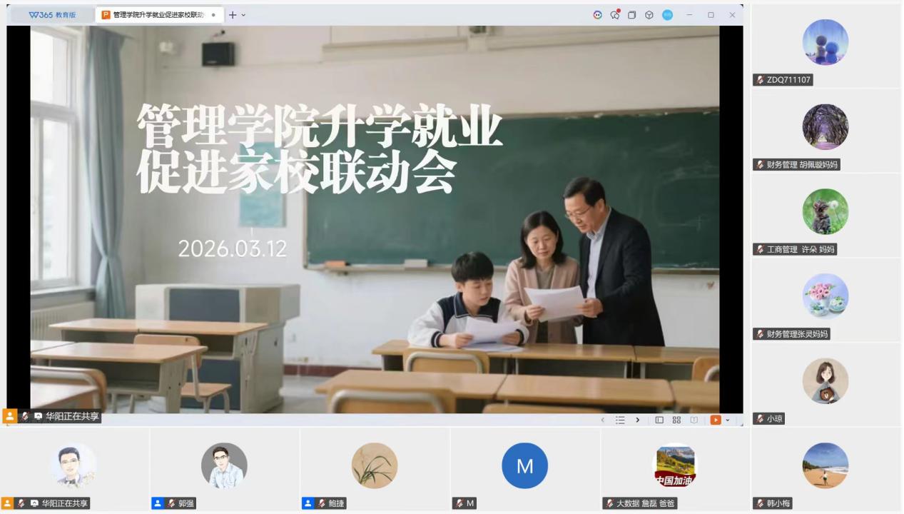 为切实做好2026届毕业生升学就业工作,明晰发展形势、锚定发展方向,3月12日晚,南京邮电大学久久久国产精品召开升学就业促进家校联动线上会议。久久久国产精品党委副书记、副院长郭强教授,2022级辅导员鲍捷老师、华阳老师出席会议,2022级毕业班全体学生及家长共同参会。