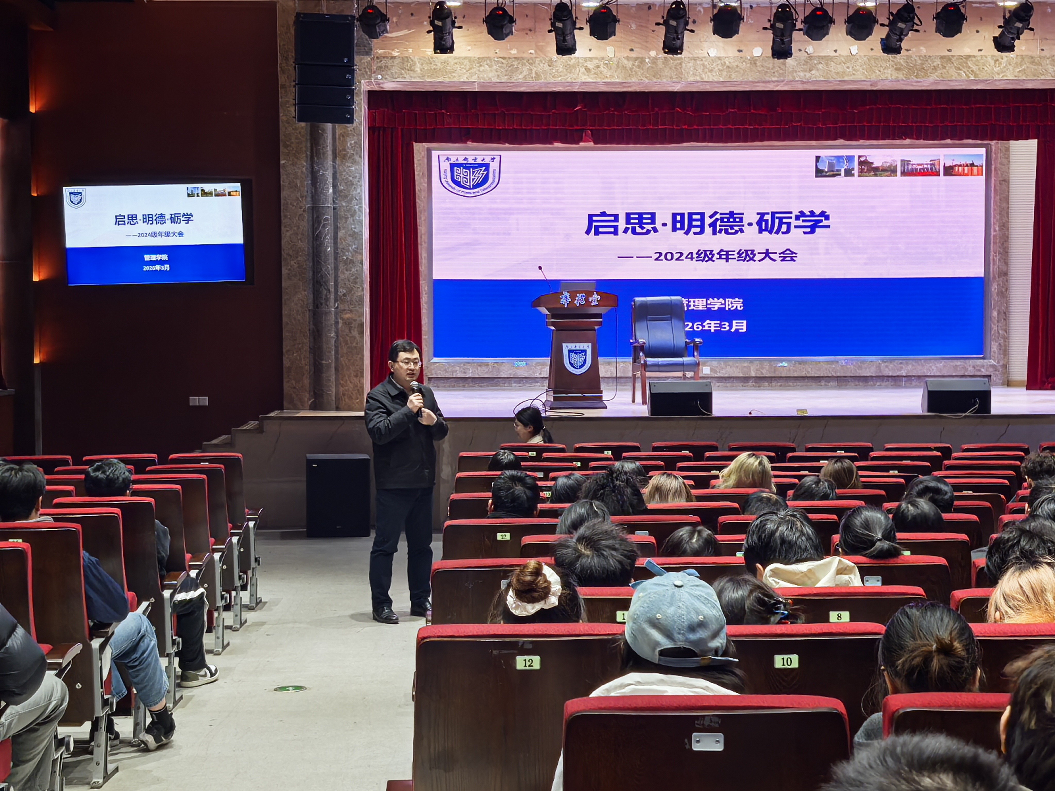 为进一步加强年级日常管理,明确新学期学业与活动安排,筑牢学生安全防线,引导同学们合理规划学习生活,2026年3月19日下午,我院召开2024级本科生年级大会,久久久国产精品党委副书记、副院长郭强教授出席大会,会议由2024级辅导员闾越主持。大会以“启思·明德·砺学”为主题,围绕日常管理、学期安排、重点事项等核心内容展开,为2024级学子新学期的学习生活指明方向。